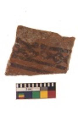 | Description / विवरण | Specimen of black on red ware with black decorative Lattice design geometric painting. |