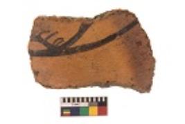 | Description / विवरण | Specimen of black on red ware with black decorative Curved lines geometric painting. |