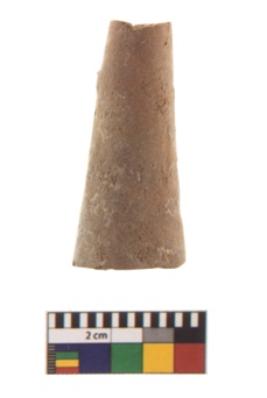 | Description / विवरण | A partially broken Specimen of a Terracotta Pendant. It is made of red ware, fine fabric, well-fired. It is cylindrical in shape with tapering upwards. |