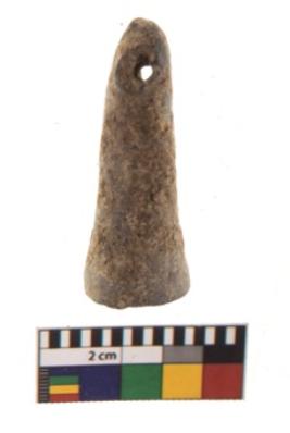 | Description / विवरण | A partially broken Specimen of a Terracotta Pendant. It is made of red ware, fine fabric, well-fired. It is cylindrical in shape with tapering upwards. The base of this object is flat and the hole for suspension is provided near the top. |