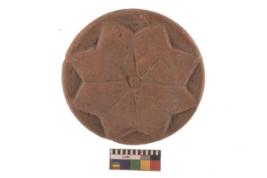 | Description / विवरण | Specimen of ground disc made from a red ware. It has jagged edges with sign of chipping. It is rounded in shape with graffiti flower design. |