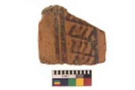 | Description / विवरण | Specimen of black on red ware with black decorative Vertical lines and row of arcs with short vertical strokes geometric painting. |