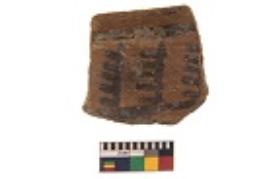| Description / विवरण | Specimen of black on red ware with black decorative Vertical lines and row of arcs with short vertical strokes geometric painting. |