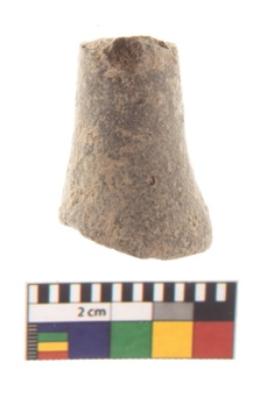 | Description / विवरण | A partially broken Specimen of a Terracotta Pendant. It is made of red ware, fine fabric, well-fired. It is cylindrical in shape with tapering upwards. |