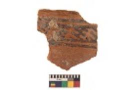 | Description / विवरण | Specimen of black on red ware with black decorative Vertical lines and row of arcs with short vertical strokes geometric painting. |