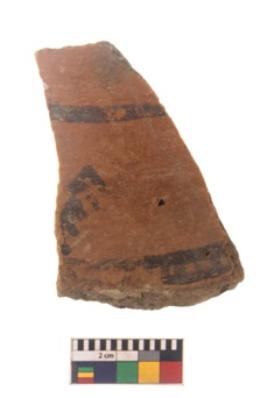| Description / विवरण | Specimen of black on red ware with black decorative Lattice and line with strokes geometric painting. |