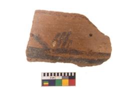 | Description / विवरण | Specimen of black on red ware with black decorative Curve and strokes geometric painting. |