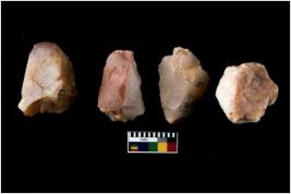 | Description / विवरण | There are n 4 utilized flakes. There are multi directional irregular scar pattern on both dorsal and ventral face of the flakes. three are chalcedony and one has chert, three are tapering at one end and one has rounded edges. |