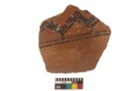 | Description / विवरण | Specimen of black on red ware with black decorative Lattice leaves and arch like design geometric painting. |