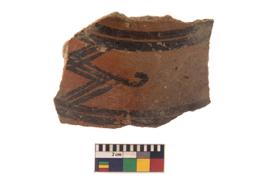 | Description / विवरण | Specimen of black on red ware with black decorative Broad zigzag and curved lines geometric painting. |