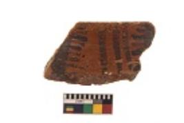 | Description / विवरण | Specimen of black on red ware with black decorative Vertical lines and row of arcs with short vertical strokes geometric painting. |