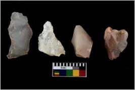 | Description / विवरण | There are n 4 utilized flakes. There are multi directional irregular scar pattern on both dorsal and ventral face of the flakes. three are chalcedony, and one has chert, three are sharp at one end and one has broom marks edge. |