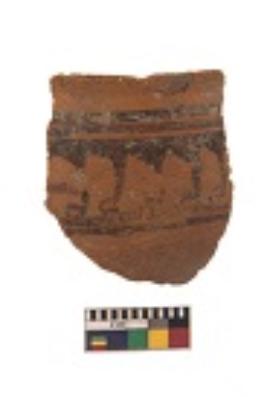 | Description / विवरण | Specimen of black on red ware with black decorative Arch like design and suspended loop with a circle on the left geometric painting. |