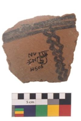 | Description / विवरण | Specimen of black on red ware with black decorative Wavy lines geometric painting. |
