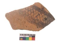 | Description / विवरण | Specimen of black on red ware with black decorative Diamond lattice design geometric painting. |