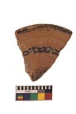 | Description / विवरण | Specimen of black on red ware with black decorative Curved lines geometric painting. |
