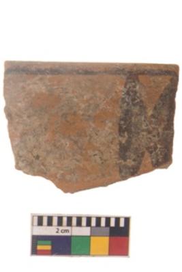 | Description / विवरण | Specimen of black on red ware with black decorative Double axe like design geometric painting. |