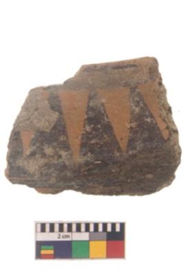 | Description / विवरण | Specimen of black on red ware with black decorative Group of elongated vertical triangles geometric painting. |