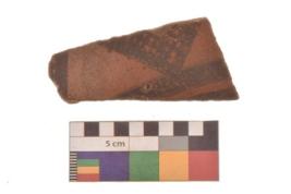 | Description / विवरण | Specimen of Potsherd with black decorative geometric diamond set broad horizontal bands painting . |
