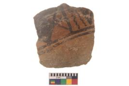| Description / विवरण | Specimen of black on red ware with black decorative Broad double axe like design and wavy lines geometric painting. |