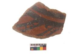 | Description / विवरण | Specimen of black on red ware with black decorative Curves with intersecting lines geometric painting. |