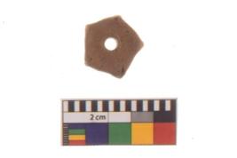 | Description / विवरण | Specimen of a Terracotta Pendant. It is made of red ware, fine fabric, well-fired. It is pentangular in shape with center perforation. |