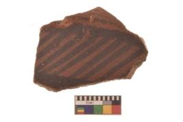 | Description / विवरण | Specimen of Potsherd black on red painted pottery. linear pattern |