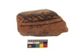 | Description / विवरण | Specimen of black on red ware with black decorative Lattice pattern geometric painting. |