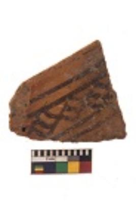 | Description / विवरण | Specimen of black on red ware with black decorative Lattice design and horizontal lines geometric painting. |