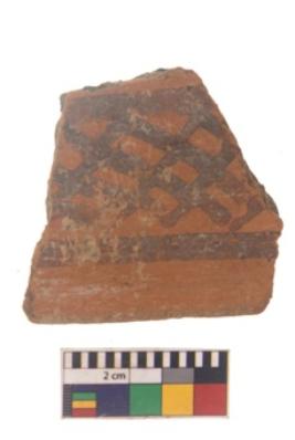 | Description / विवरण | Specimen of black on red ware with black decorative Lattice pattern geometric painting. |