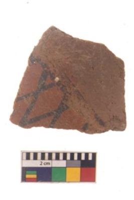 | Description / विवरण | Specimen of black on red ware with black decorative Lattice pattern geometric painting. |