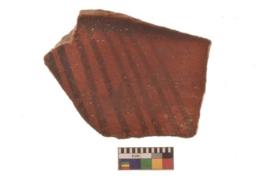 | Description / विवरण | Specimen of Potsherd black on red painted pottery. linear pattern |