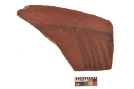 | Description / विवरण | Specimen of Potsherd black on red painted pottery. linear pattern |