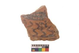 | Description / विवरण | Specimen of black on red ware with black decorative Wavy lines geometric painting. |