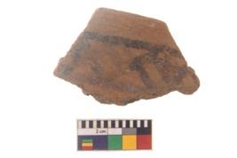 | Description / विवरण | Specimen of black on red ware with black decorative Lattice pattern geometric painting. |