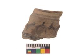 | Description / विवरण | Specimen of black on red ware with black decorative Zigzag lines with strokes geometric painting. |