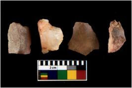 | Description / विवरण | There are n 4 utilized flakes. There are multi directional irregular scar pattern on both dorsal and ventral face of the flakes. three are chert, and one has chalcedony, three are tapering at one end and one has sharp edges. |