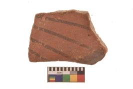 | Description / विवरण | Specimen of Potsherd black on red painted pottery. linear pattern |
