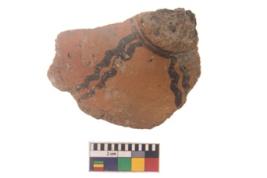 | Description / विवरण | Specimen of black on red ware with black decorative Wavy lines and circle geometric painting. |
