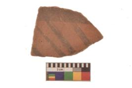 | Description / विवरण | Specimen of Potsherd black on red painted pottery. linear pattern |