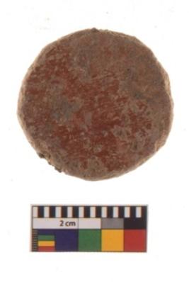 | Description / विवरण | Specimen of ground disc hopscotch made from a red ware. It has jagged edges with sign of chipping. It is rounded in shape. |