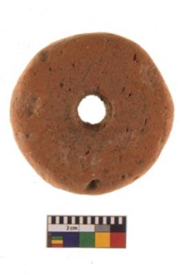 | Description / विवरण | A partially broken specimen of terracotta spindle whorl. It has eroded from the area around the perforation and diameter edge. The outer edge is uneven. It is wheel-made with well-levigated clay. It is quite light-weight. It is reddish in colour and well fired. |