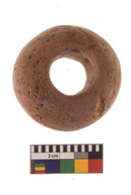 | Description / विवरण | A partially broken specimen of terracotta spindle whorl. It has eroded from the area around the perforation and diameter edge. The outer edge is uneven. It is wheel-made with well-levigated clay. It is quite light-weight. It is reddish in colour and well fired. |