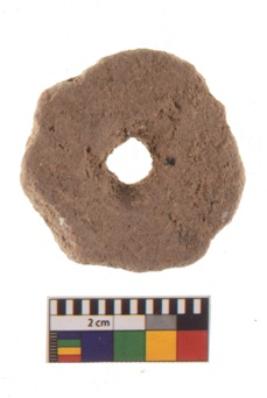 | Description / विवरण | A partially broken specimen of terracotta spindle whorl. It has eroded from the area around the perforation and diameter edge. It is reddish in colour and ill fired. |