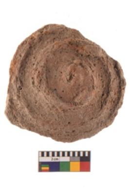 | Description / विवरण | Specimen of ground disc hopscotch made from a red ware. It has jagged edges with sign of chipping. It is rounded in shape. |
