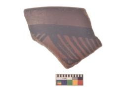 | Description / विवरण | Specimen of Potsherd black on red painted pottery. linear pattern |