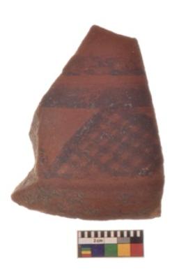 | Description / विवरण | Specimen of Potsherd with black decorative geometric diamond set broad horizontal bands painting |