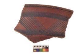 | Description / विवरण | Specimen of Potsherd black on red painted pottery. linear pattern |