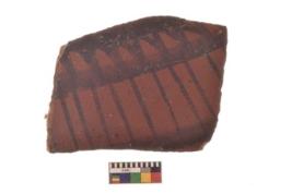 | Description / विवरण | Specimen of Potsherd black on red painted pottery. linear pattern |