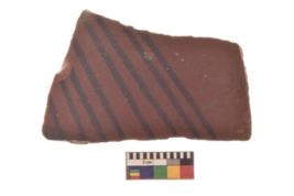 | Description / विवरण | Specimen of Potsherd black on red painted pottery. linear pattern |